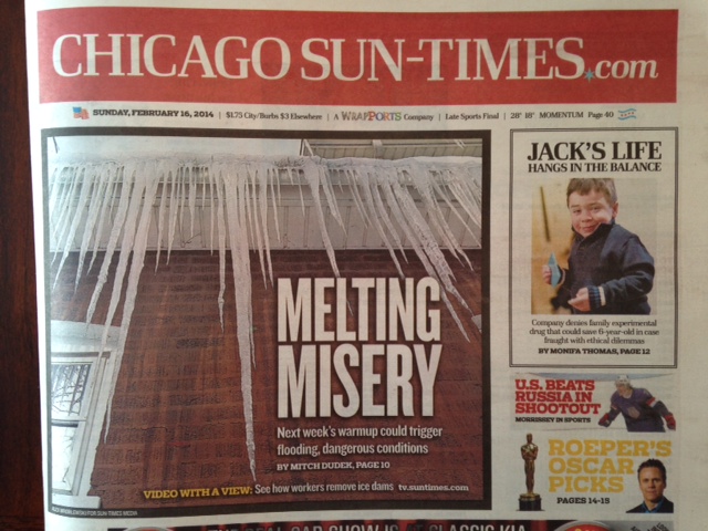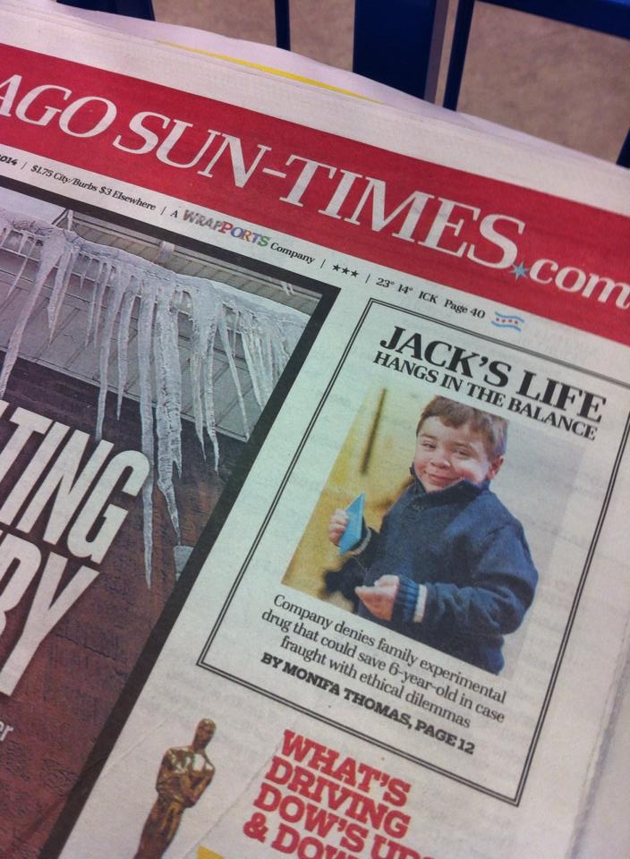 We continue to share our story with the media. Yesterday our story was posted online and today our story was featured on the front page of the Chicago Sun-Times. We are receiving a lot of feedback and support! Social media, specifically Twitter and Facebook have photos of Jack plastered all over it. It is definitely not the story we want viewed around the world, but we remain hopeful that soon we can share with the world that Shire is our hero and Jack is saved!