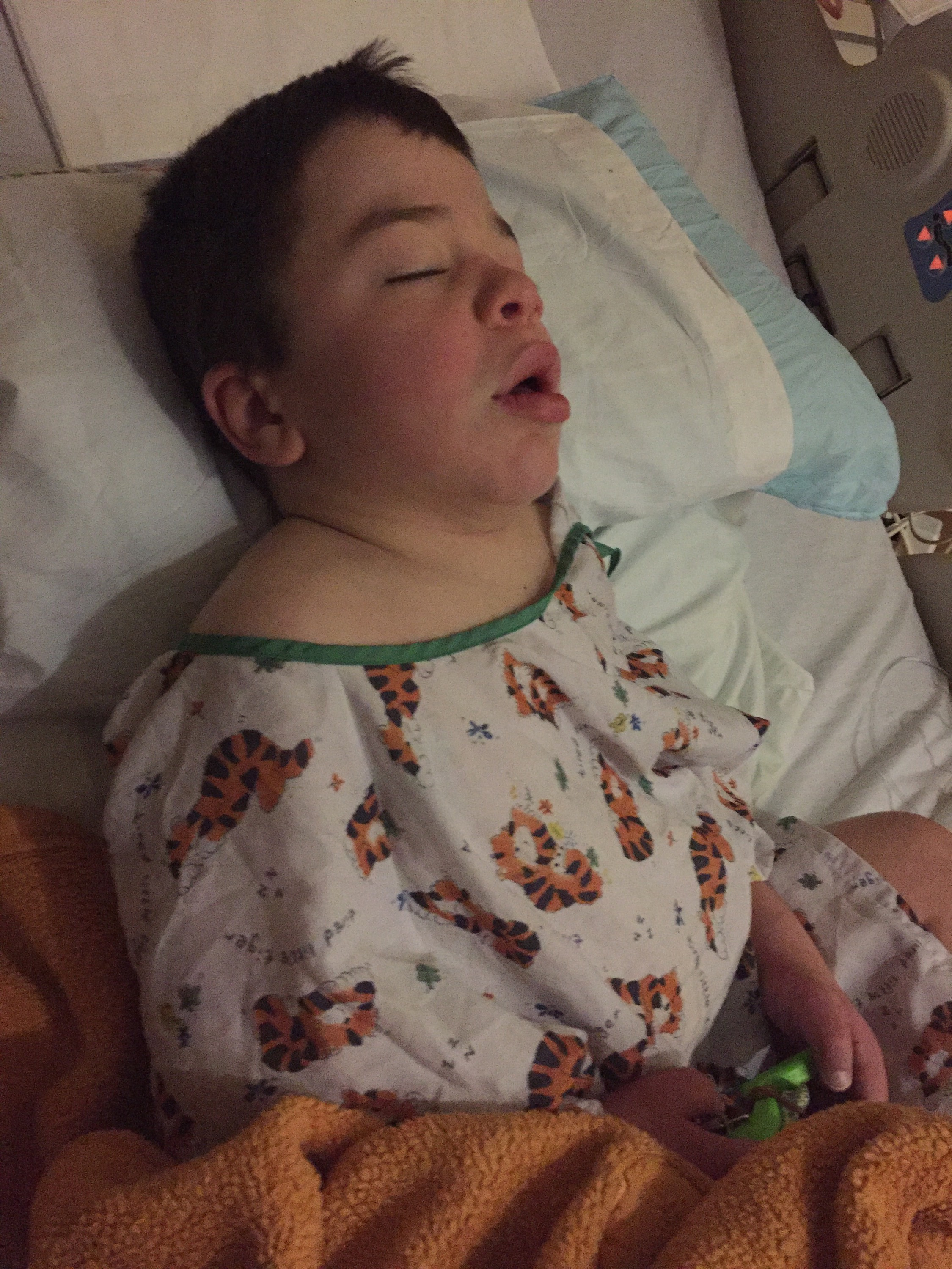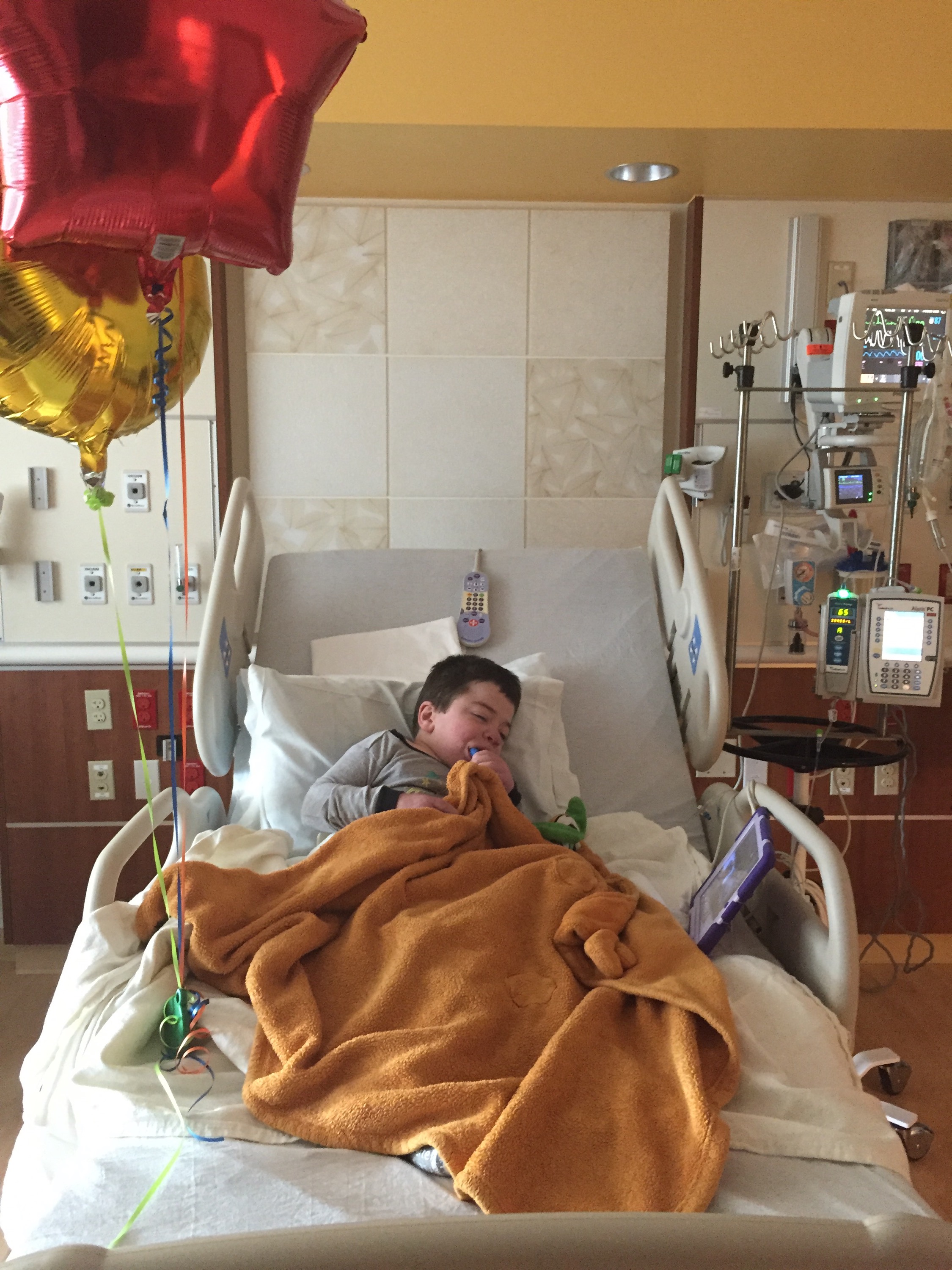 Today we have our training on care, usage, and troublshooting with his new medical devices (Mic-Key button, tubes, pumps, bolus, syringes…). And hopefully he will be able to taste some food by mouth today. His blanket has not been cutting it. Jack loves food and it’s so heartbreaking to neglect him of it. Thinking pancakes, sausage, strawberries and yogurt will be ordered up, his fave foods!